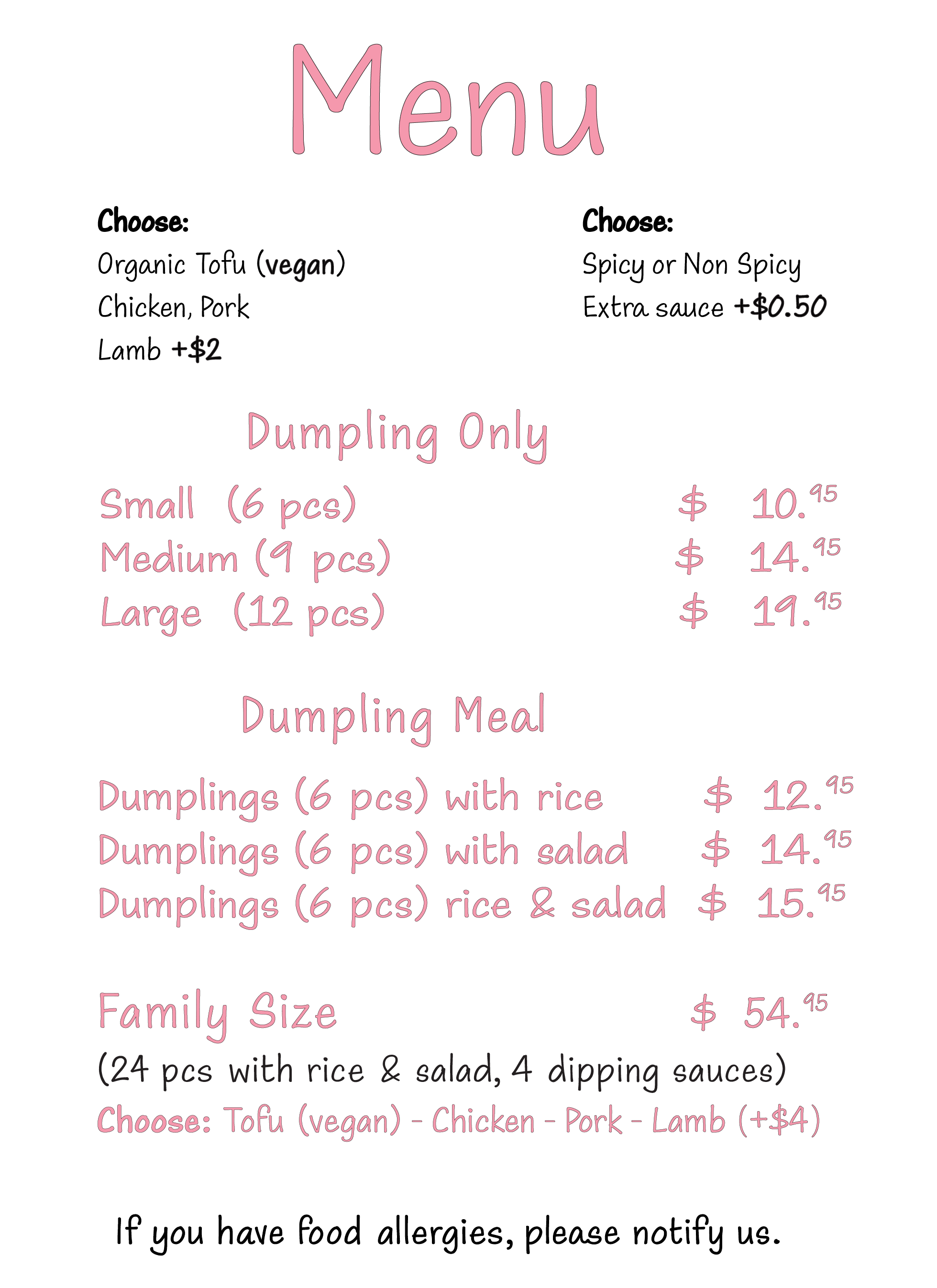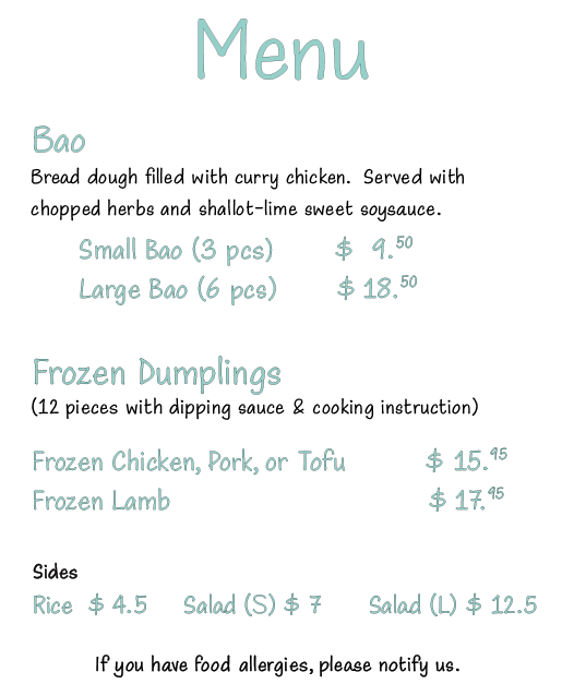 Dumplings are cooked to order and packed in a compostable food container. Although it is a take-out restaurant, customers can enjoy their dumplings at a few picnic tables with a vineyard view during nice weather seasons. While we are not equipped to provide dine-in services and are not allowed to serve any alcoholic beverages with Sans Dumplings, there are nearby wineries and breweries that will welcome you to enjoy Sans Dumplings with their beverages.